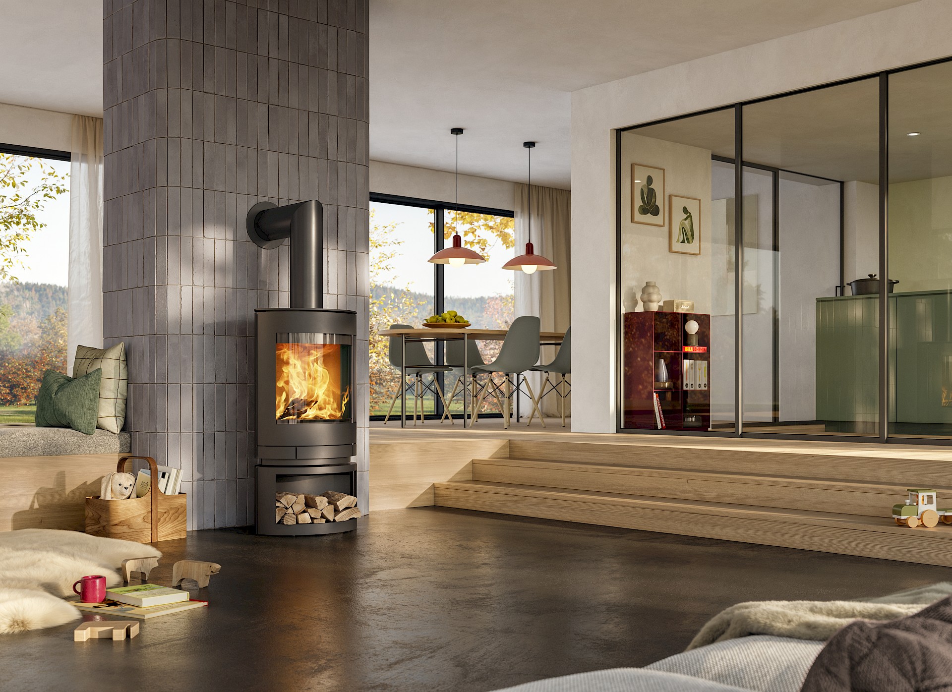Die große Sichtscheibe eröffnet einen eindrucksvollen Blick auf das Flammenspiel und schafft eine lebendige, warme Atmosphäre. Dank moderner Verbrennungstechnik arbeitet der emotion S effizient, sauber und holzsparend – für nachhaltigen Heizkomfort und ein angenehmes Raumklima.